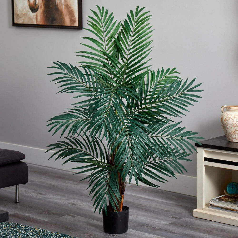 The classic palm tree look, forever captured for your decorating pleasure. This Areca palm tree is 4 ft. height, with a robust trunk and hundreds of pointed palm leaves that will bring a little sunshine to any area of your home or office. Never needs water or sun, so it truly becomes a