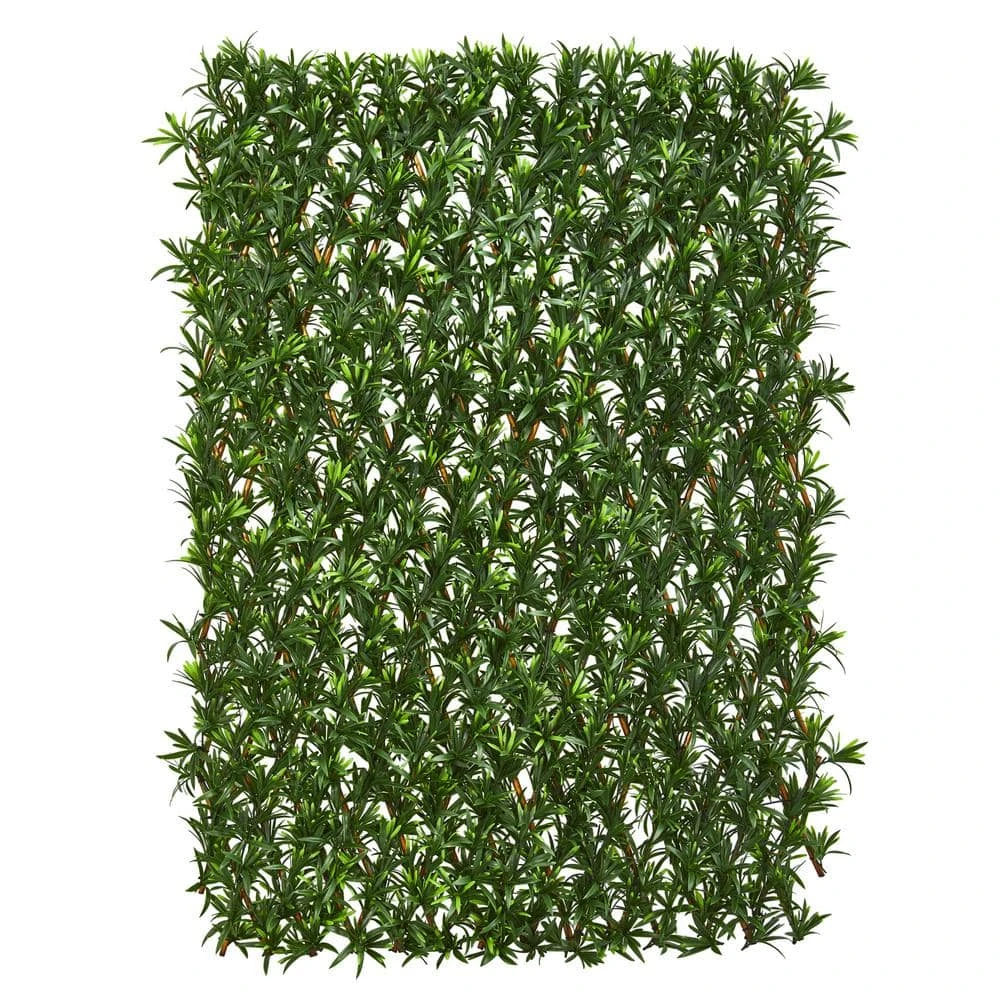 Add greenery and privacy to your outdoor space with this expandable artificial podocarpus privacy fence hedge. Designed to resemble a real evergreen shrub, it stretches from 16 in. to 84 in. wide, making it ideal for flexible coverage needs. Use this maintenance-free artificial hedge to conceal unsightly views or create a decorative privacy fence for balconies, patios, or walkways. UV-resistant and waterproof, it’s built to withstand the elements beautifully.